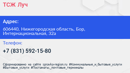 ТСЖ Луч по адресу 606440, Нижегородская область, Бор, Интернациональная, 32а в дальнейшем Организация, размещена в следующих категориях: