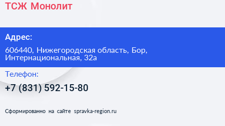 ТСЖ Монолит по адресу 606440, Нижегородская область, Бор, Интернациональная, 32а в дальнейшем Организация, размещена в следующих категориях: