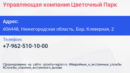 Управляющая компания Цветочный Парк по адресу 606448, Нижегородская область, Бор, Клеверная, 2 в дальнейшем Организация, размещена в следующих категориях: