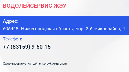 ВОДОЛЕЙСЕРВИС, ЖЭУ по адресу 606448, Нижегородская область, Бор, 2-й микрорайон, 4 в дальнейшем Организация, размещена в следующих категориях: