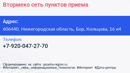 Втормеко, сеть пунктов приема по адресу 606440, Нижегородская область, Бор, Кольцова, 16 к4 в дальнейшем Организация, размещена в следующих категориях: