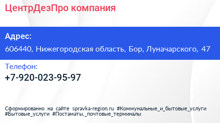 ЦентрДезПро, компания по адресу 606440, Нижегородская область, Бор, Луначарского, 47 в дальнейшем Организация, размещена в следующих категориях: