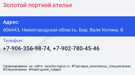 Золотой портной, ателье по адресу 606443, Нижегородская область, Бор, Вали Котика, 8 в дальнейшем Организация, размещена в следующих категориях: