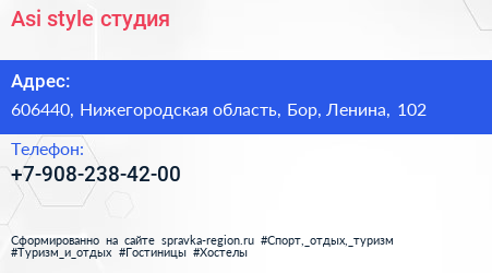 Asi style, студия по адресу 606440, Нижегородская область, Бор, Ленина, 102 в дальнейшем Организация, размещена в следующих категориях:
