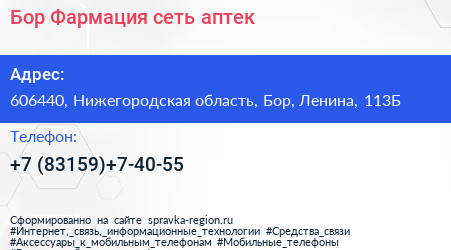 Бор Фармация, сеть аптек по адресу 606440, Нижегородская область, Бор, Ленина, 113Б в дальнейшем Организация, размещена в следующих категориях: