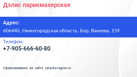 Дэлис, парикмахерская по адресу 606440, Нижегородская область, Бор, Ванеева, 159 в дальнейшем Организация, размещена в следующих категориях: