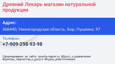 Древний Лекарь, магазин натуральной продукции по адресу 606440, Нижегородская область, Бор, Пушкина, 97 в дальнейшем Организация, размещена в следующих категориях: