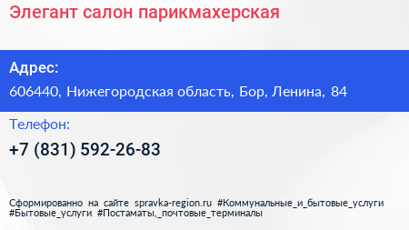 Элегант, салон-парикмахерская по адресу 606440, Нижегородская область, Бор, Ленина, 84 в дальнейшем Организация, размещена в следующих категориях: