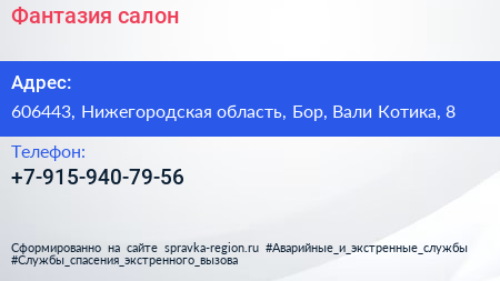Фантазия, салон по адресу 606443, Нижегородская область, Бор, Вали Котика, 8 в дальнейшем Организация, размещена в следующих категориях: