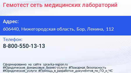 Гемотест, сеть медицинских лабораторий по адресу 606440, Нижегородская область, Бор, Ленина, 112 в дальнейшем Организация, размещена в следующих категориях: