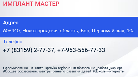 ИМПЛАНТ МАСТЕР по адресу 606440, Нижегородская область, Бор, Первомайская, 10а в дальнейшем Организация, размещена в следующих категориях: