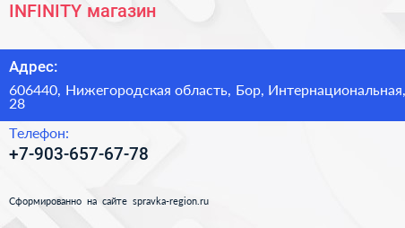 INFINITY, магазин по адресу 606440, Нижегородская область, Бор, Интернациональная, 28 в дальнейшем Организация, размещена в следующих категориях: