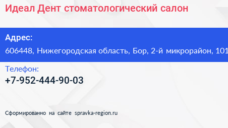 Идеал Дент, стоматологический салон по адресу 606448, Нижегородская область, Бор, 2-й микрорайон, 101 в дальнейшем Организация, размещена в следующих категориях: