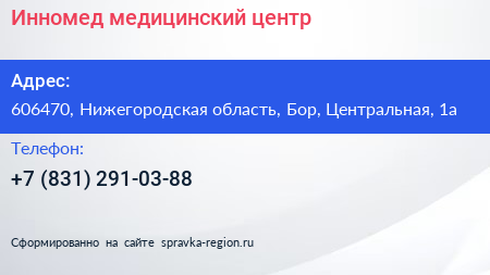 Инномед, медицинский центр по адресу 606470, Нижегородская область, Бор, Центральная, 1а в дальнейшем Организация, размещена в следующих категориях: