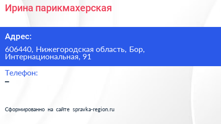 Ирина, парикмахерская по адресу 606440, Нижегородская область, Бор, Интернациональная, 91 в дальнейшем Организация, размещена в следующих категориях: