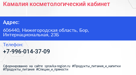 Камалия, косметологический кабинет по адресу 606440, Нижегородская область, Бор, Интернациональная, 23Б в дальнейшем Организация, размещена в следующих категориях: