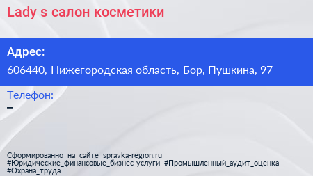 Lady`s, салон косметики по адресу 606440, Нижегородская область, Бор, Пушкина, 97 в дальнейшем Организация, размещена в следующих категориях:
