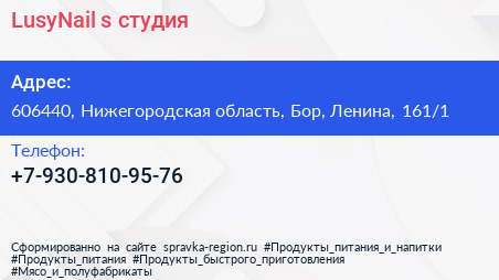 LusyNail`s, студия по адресу 606440, Нижегородская область, Бор, Ленина, 161/1 в дальнейшем Организация, размещена в следующих категориях: