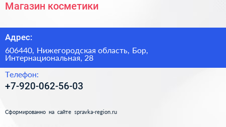 Магазин косметики по адресу 606440, Нижегородская область, Бор, Интернациональная, 28 в дальнейшем Организация, размещена в следующих категориях:
