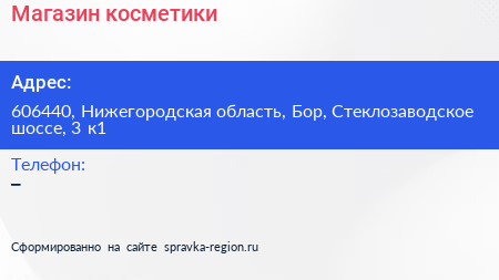 Магазин косметики по адресу 606440, Нижегородская область, Бор, Стеклозаводское шоссе, 3 к1 в дальнейшем Организация, размещена в следующих категориях: