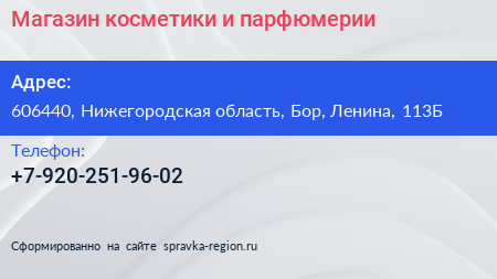 Магазин косметики и парфюмерии по адресу 606440, Нижегородская область, Бор, Ленина, 113Б в дальнейшем Организация, размещена в следующих категориях: