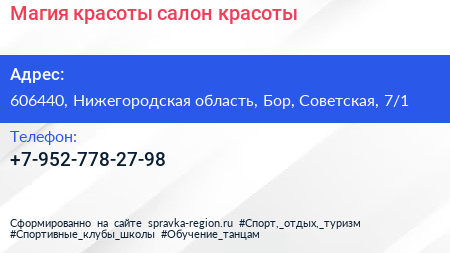 Магия красоты, салон красоты по адресу 606440, Нижегородская область, Бор, Советская, 7/1 в дальнейшем Организация, размещена в следующих категориях: