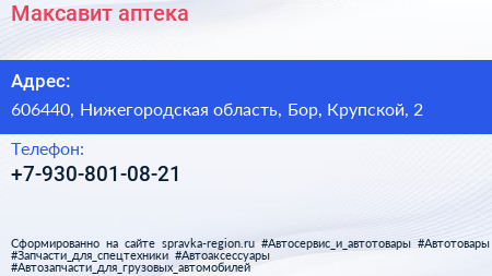 Максавит, аптека по адресу 606440, Нижегородская область, Бор, Крупской, 2 в дальнейшем Организация, размещена в следующих категориях: