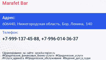 Marafet Bar по адресу 606440, Нижегородская область, Бор, Ленина, 140 в дальнейшем Организация, размещена в следующих категориях: