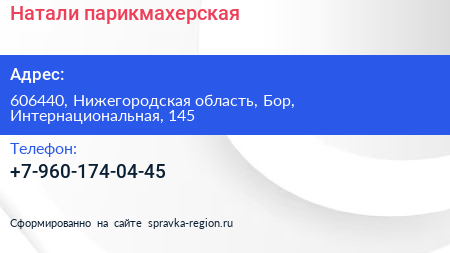 Натали, парикмахерская по адресу 606440, Нижегородская область, Бор, Интернациональная, 145 в дальнейшем Организация, размещена в следующих категориях: