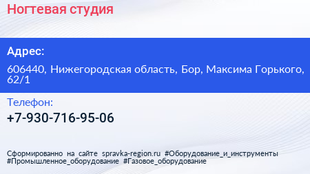Ногтевая студия по адресу 606440, Нижегородская область, Бор, Максима Горького, 62/1 в дальнейшем Организация, размещена в следующих категориях: