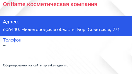 Oriflame, косметическая компания по адресу 606440, Нижегородская область, Бор, Советская, 7/1 в дальнейшем Организация, размещена в следующих категориях: