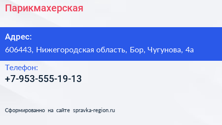 Парикмахерская по адресу 606443, Нижегородская область, Бор, Чугунова, 4а в дальнейшем Организация, размещена в следующих категориях: