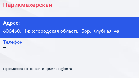 Парикмахерская по адресу 606460, Нижегородская область, Бор, Клубная, 4а в дальнейшем Организация, размещена в следующих категориях: