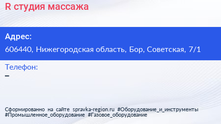 R-студия массажа по адресу 606440, Нижегородская область, Бор, Советская, 7/1 в дальнейшем Организация, размещена в следующих категориях: