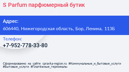 S.Parfum, парфюмерный бутик по адресу 606440, Нижегородская область, Бор, Ленина, 113Б в дальнейшем Организация, размещена в следующих категориях: