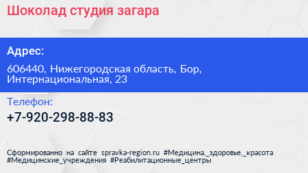 Шоколад, студия загара по адресу 606440, Нижегородская область, Бор, Интернациональная, 23 в дальнейшем Организация, размещена в следующих категориях: