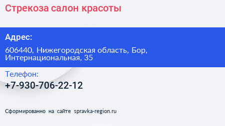 Стрекоза, салон красоты по адресу 606440, Нижегородская область, Бор, Интернациональная, 35 в дальнейшем Организация, размещена в следующих категориях: