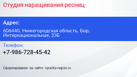 Студия наращивания ресниц по адресу 606440, Нижегородская область, Бор, Интернациональная, 23Б в дальнейшем Организация, размещена в следующих категориях: