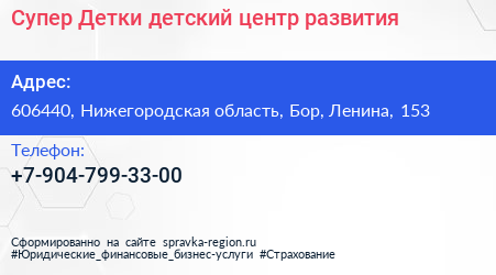 Супер Детки, детский центр развития по адресу 606440, Нижегородская область, Бор, Ленина, 153 в дальнейшем Организация, размещена в следующих категориях: