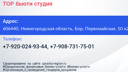 TOP, бьюти студия по адресу 606440, Нижегородская область, Бор, Первомайская, 10 к2 в дальнейшем Организация, размещена в следующих категориях: