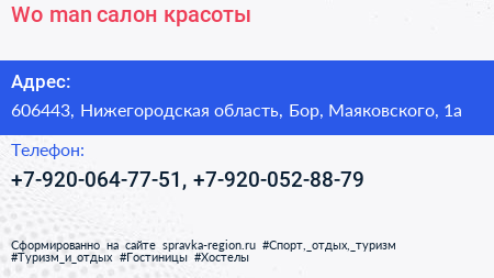 Wo-man, салон красоты по адресу 606443, Нижегородская область, Бор, Маяковского, 1а в дальнейшем Организация, размещена в следующих категориях: