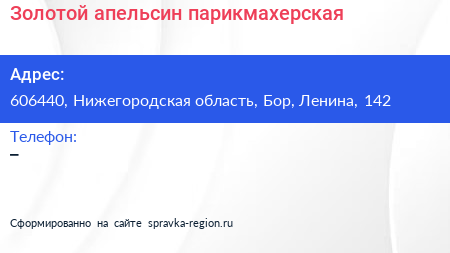 Золотой апельсин, парикмахерская по адресу 606440, Нижегородская область, Бор, Ленина, 142 в дальнейшем Организация, размещена в следующих категориях: