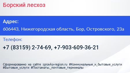 Борский лесхоз по адресу 606443, Нижегородская область, Бор, Островского, 23а в дальнейшем Организация, размещена в следующих категориях: