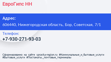 ЕвроГипс-НН по адресу 606440, Нижегородская область, Бор, Советская, 7/1 в дальнейшем Организация, размещена в следующих категориях: