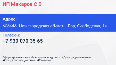 ИП Макаров С.В. по адресу 606446, Нижегородская область, Бор, Слободская, 1а в дальнейшем Организация, размещена в следующих категориях: