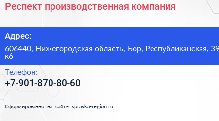 Респект, производственная компания по адресу 606440, Нижегородская область, Бор, Республиканская, 39 к6 в дальнейшем Организация, размещена в следующих категориях: