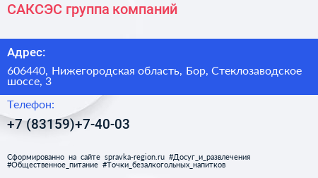 САКСЭС, группа компаний по адресу 606440, Нижегородская область, Бор, Стеклозаводское шоссе, 3 в дальнейшем Организация, размещена в следующих категориях:
