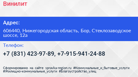 Винилит по адресу 606440, Нижегородская область, Бор, Стеклозаводское шоссе, 12а в дальнейшем Организация, размещена в следующих категориях: