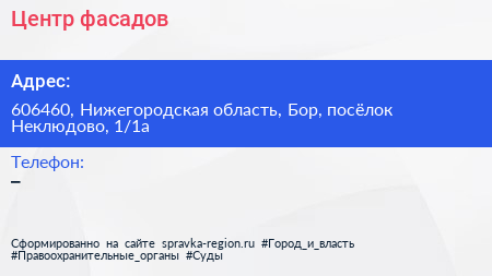 Центр фасадов по адресу 606460, Нижегородская область, Бор, посёлок Неклюдово, 1/1а в дальнейшем Организация, размещена в следующих категориях: