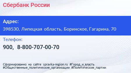 Сбербанк России по адресу 398530, Липецкая область, Боринское, Гагарина, 70 в дальнейшем Организация, размещена в следующих категориях: